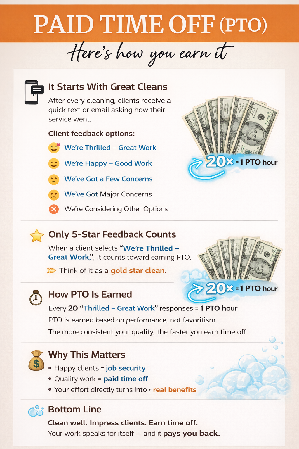 The better and more consistent your cleanings are, the faster you earn paid time off.