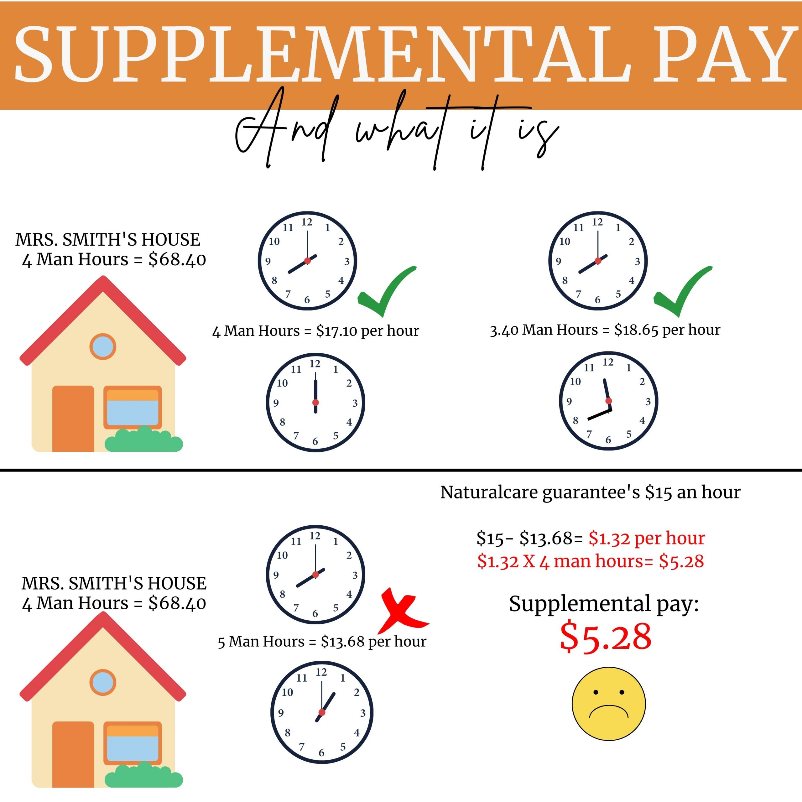 Example: Ms. Smith’s home is 4 hours and your commission is $68.4 for the job. That is $17.1/ hour if you did the home on time. If you got out 20 minutes early you would be making $18.65/hour! But let’s say you take 5 hours, then your hourly would drop to $13.68. So we look at the entire week. So if you did have a longer house but the rest of your houses were early or on time you would be fine. But let’s say you went over all your homes and your weekly hourly rate says $13.68/hour. Then Naturalcare steps in with a supplemental $1.32/hour bump to get you to your guaranteed wage! We will also follow up with you to help improve your time and get more efficient (not fast) at your cleaning. All homes have been quoted with a cushion so if you follow the flow, maintain, and have all your equipment on hand you should be getting out of your houses early or on time for the most part.